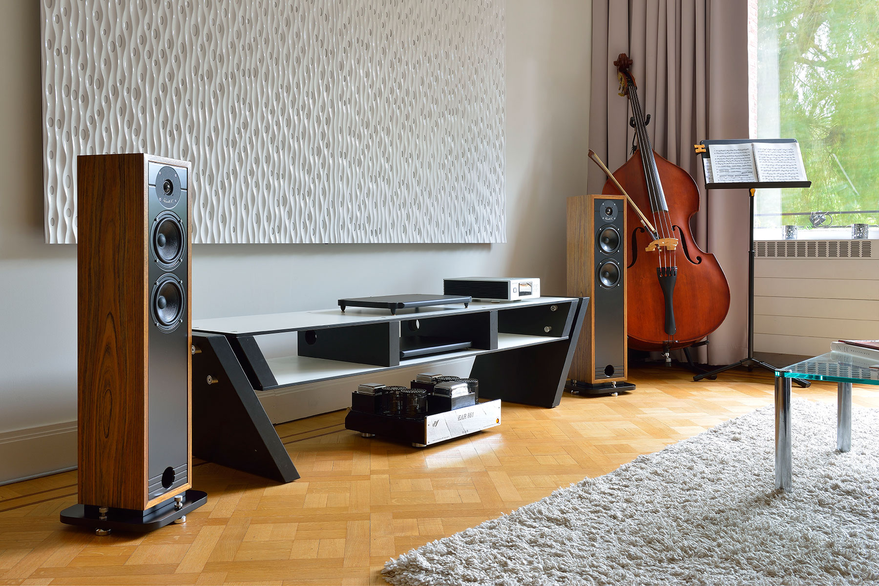 Цена: 409 000 руб. (корпус: натуральный шпон дуба или ореха, передняя панель - чёрная) 442 750 руб. (корпус и передняя панель - чёрный рояльный лак) 33 000 руб. (защитные решётки - ткань)