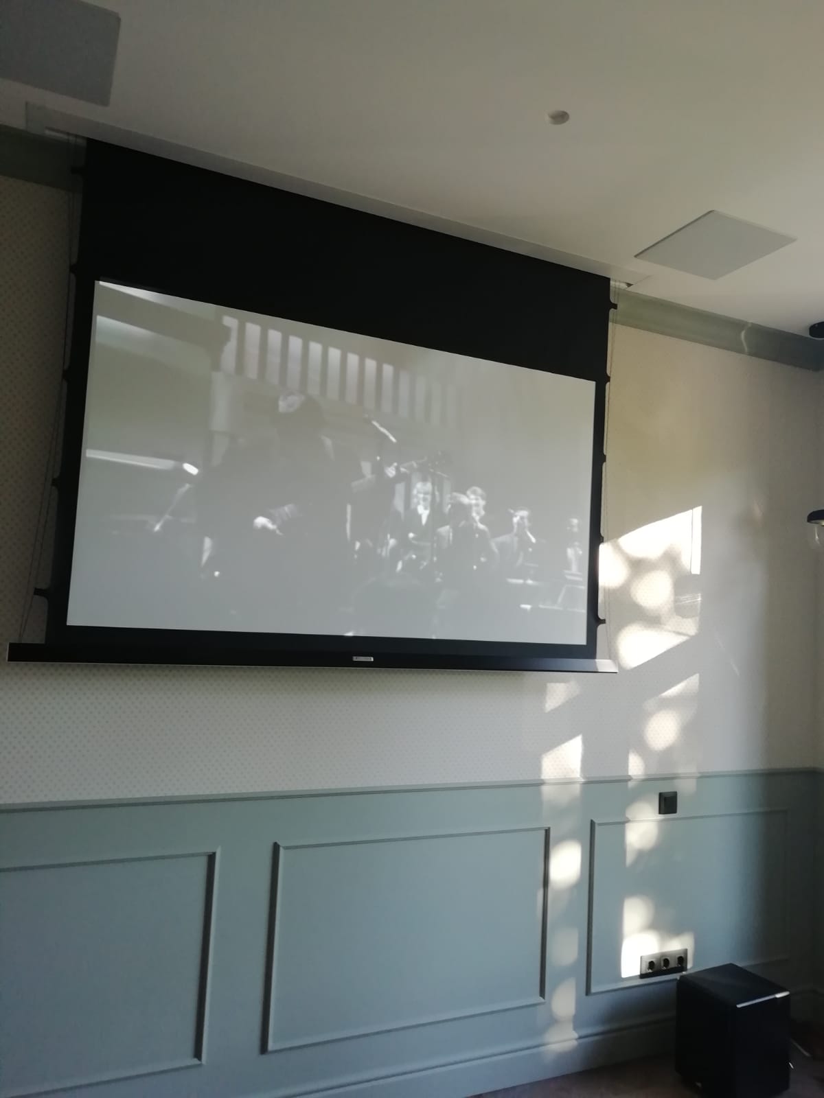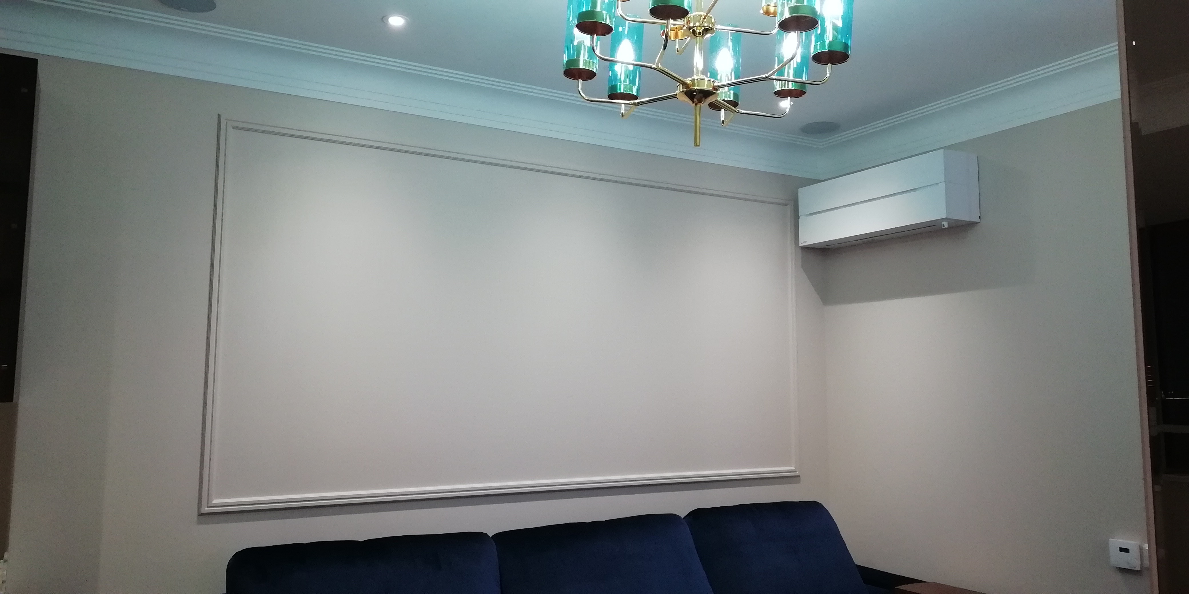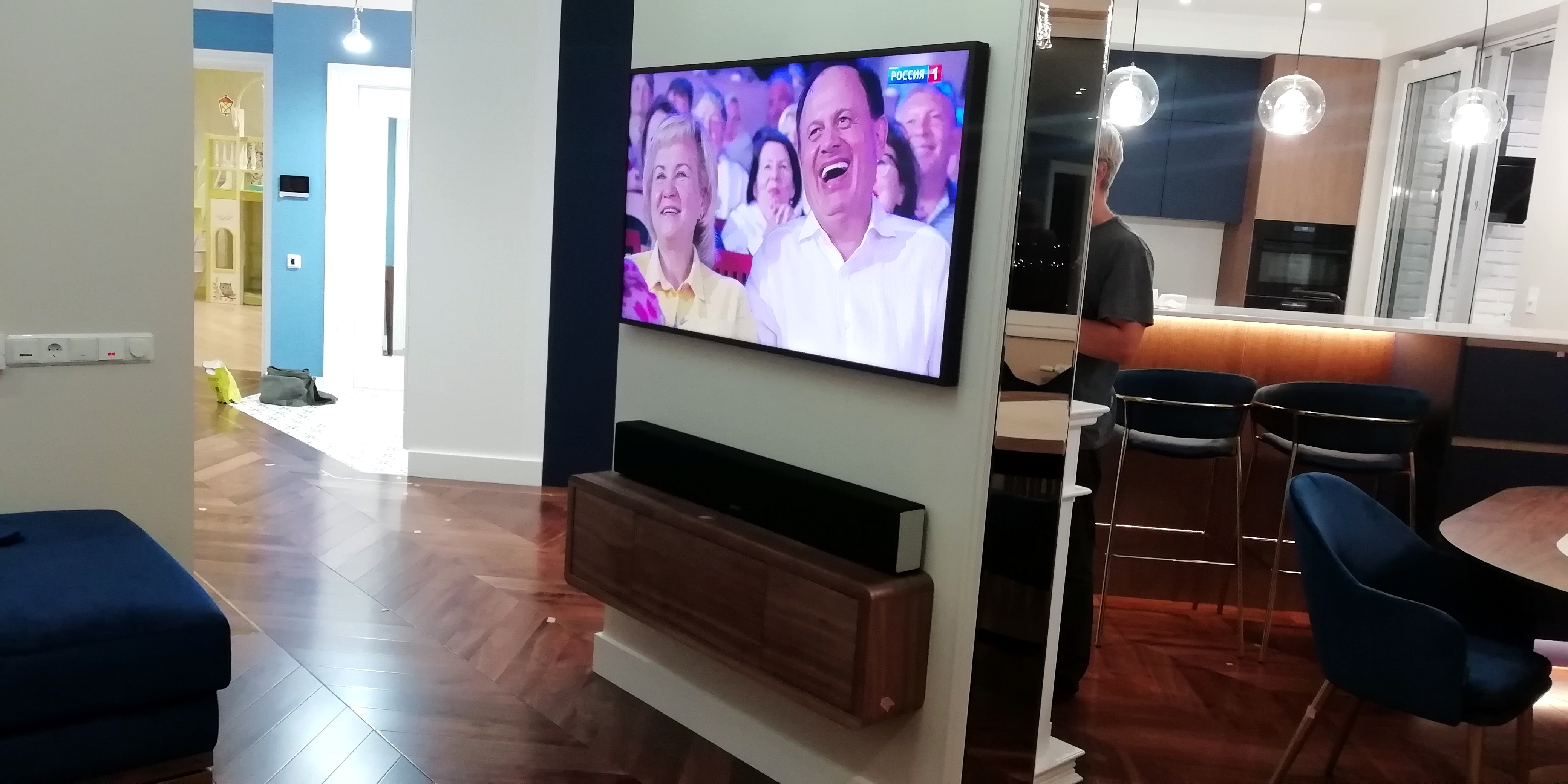 Хозяин квартиры в жилом комплексе "Два ангела" обратился в нашу компанию с просьбой помочь озвучить его жилище. По его предположению помещение должно быть разбито на три отдельные зоны, в которых можно было бы просматривать видео и прослушивать музыку как по индивидуальным сценариям, так и по единому. Причём каждая зона в свою очередь разбивалась на три суб-зоны, в которых при необходимости трансляцию можно было бы отключить. Все акустические системы, в идеале, должны быть встроены в стены и потолок, а в хозяйской спальне вместо телевизора - встраиваемый экран и проектор. По качеству изображения и звука эта зона должна стать самой продвинутой.Для установки во всех второстепенных зонах мы предложили использовать колонки французской фирмы Focal, в гостиной, где разместился домашний кинотеатр, саундбар и сабвуфер от английской компании Monitor Audio, а в мастер-спальне, где звук должен быть лучшим в квартире - направленную на слушателя потолочную встройку от канадского производителя "Totem Acoustic". Экран изготовлен польской компанией Kauber, а проектор - японской JVC. За усиление и распределение сигнала отвечает ресивер Denon. В каждой зоне есть возможность регулировать уровень громкости с помощью встраиваемых регуляторов Sonance. В детских спальнях установлены камеры видеонаблюдения, сигнал с которых может быть выведен на любой из телевизоров или проектор.
