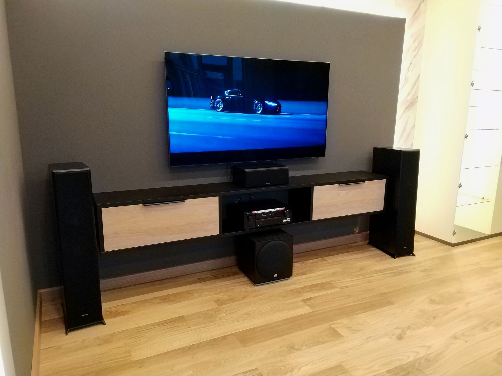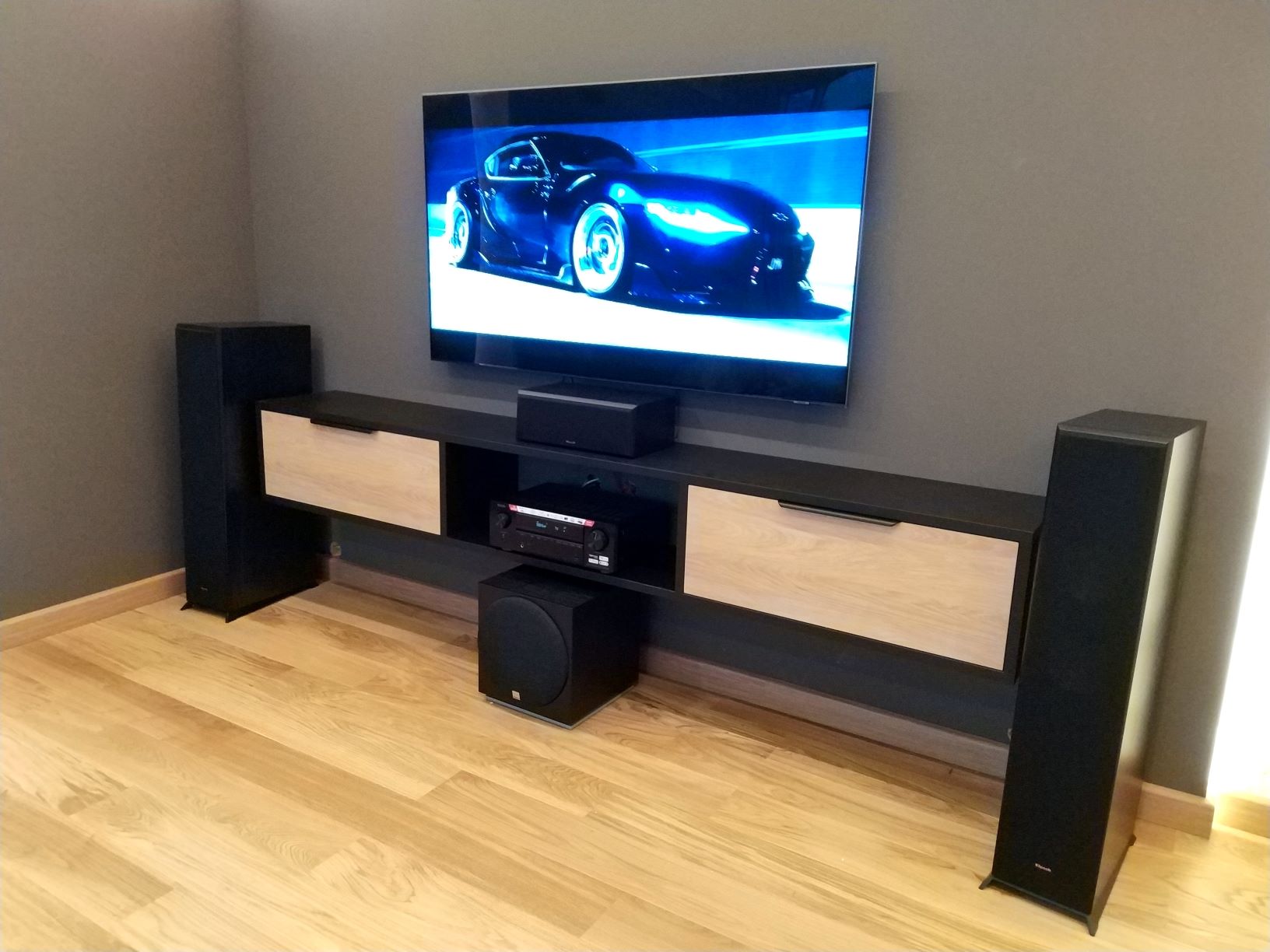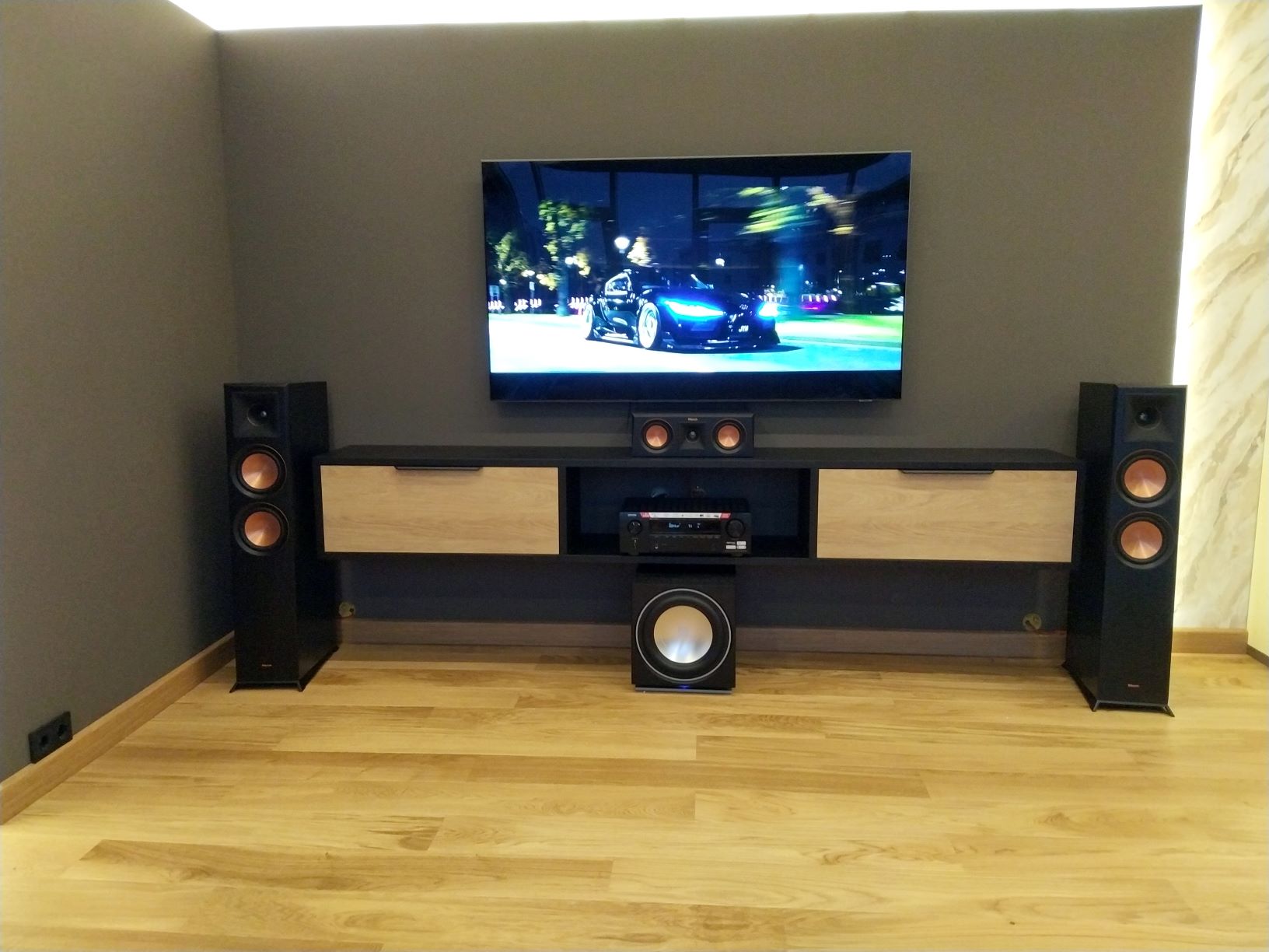 Роль центра системы было отдана проверенному временем аудио-видео ресиверу Denon. Основным же источником сигнала стала медиа приставка Dune. А в качестве монитора выступает семидесяти пяти дюймовый телевизор Samsung.