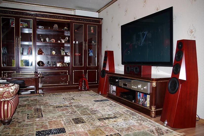 Следующим этапом стала замена колонок и AV-ресивера с DVD-проигрывателем на более дорогие. Были выбраны ресивер и Blue-Ray проигрыватель от фирмы Integra и акустические системы от компании Totem Acoustic. Колонки меняли в два захода: сначала заменили колонки на фронтальных, центральном каналах и сабвуфер. На фронт встали Totem Acoustic Arro, на центр Totem Acoustic Rainmaker Center и саб Totem Acoustic Storm. Вторым заходом Arro были перенесены на тыл , а на фронтах встали старшие на тот момент в линейке Totem Acoustc Wind. Параллельно все провода были заменены на продукцию компании Tellurium Q.